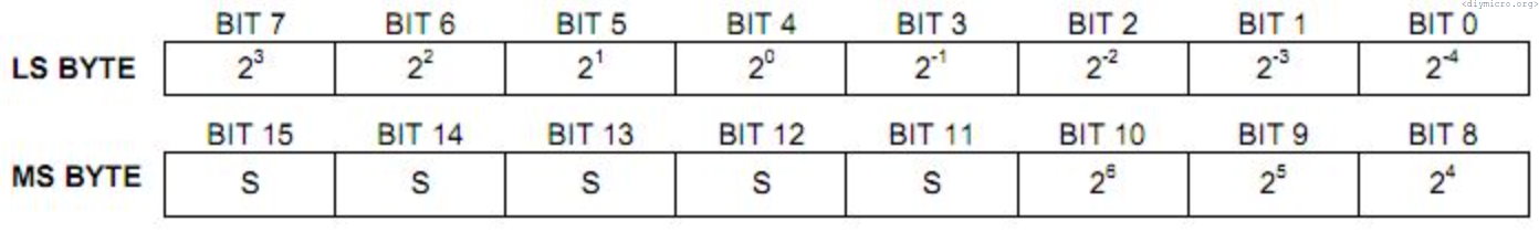 The lsb byte has 4 lsb bits for the fractional value of the temperature, while the decimal part is distributed across both bytes. S bits are the negative or positive sign indicator, 1 means that we are freezing.