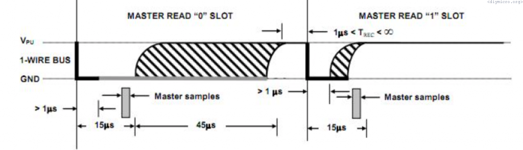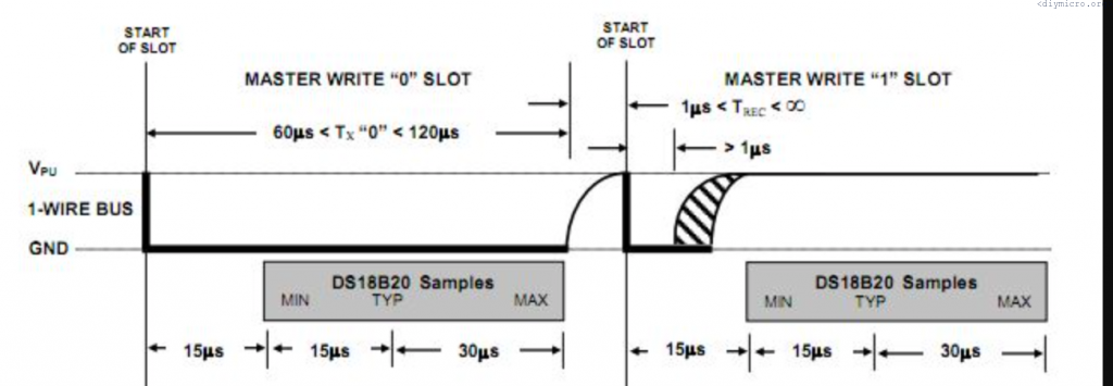 To write 0 to the sensor, the line should be pulled to the ground for 60us min, to write 1 – pull it to the ground for just 1 us, then release and wait the time according to the picture from the datasheet. Remember, LSB goes first:
